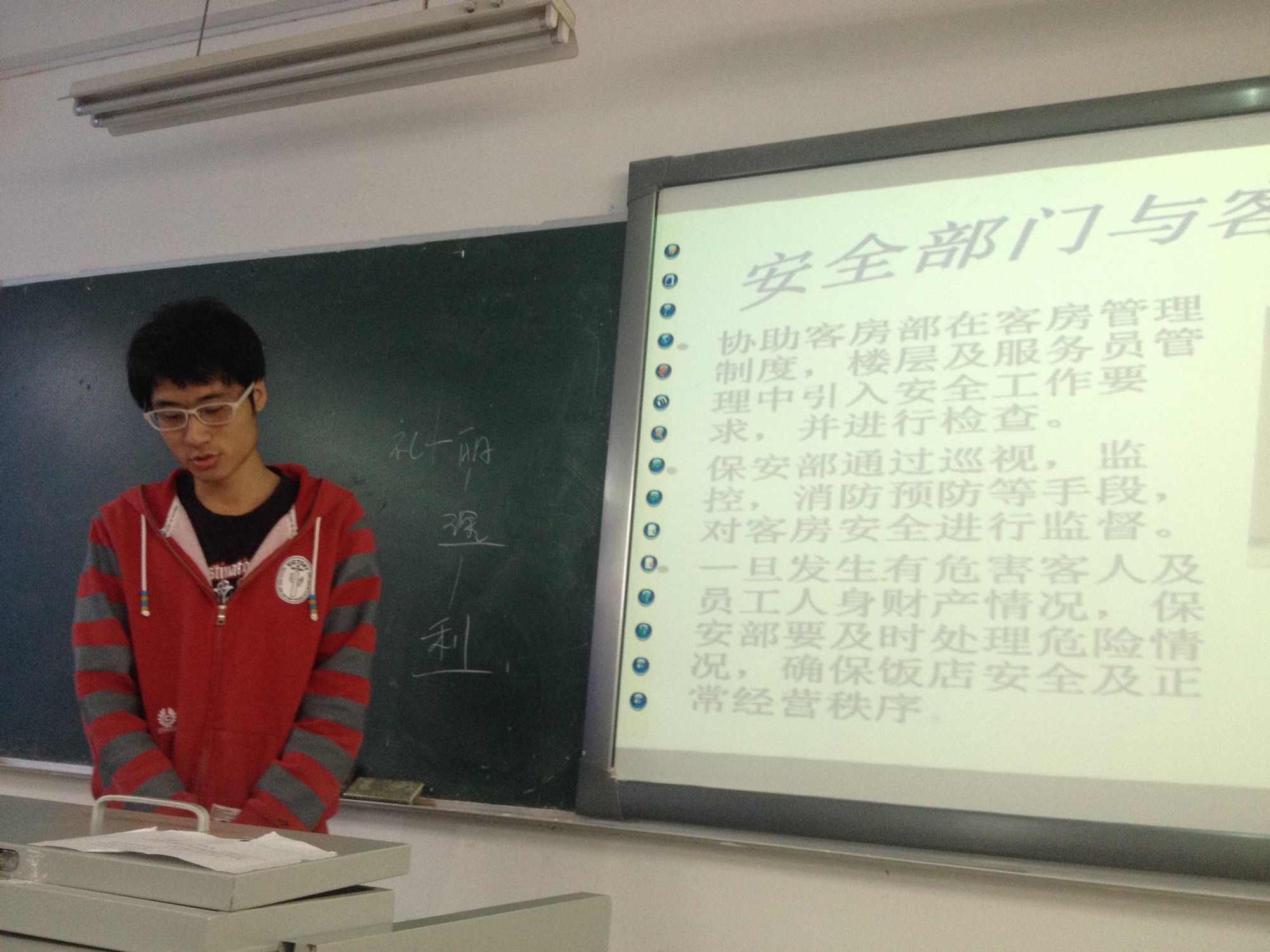 2014年5月14日,为完成《现代饭店管理》老师给我们布置的作业,全班同学都充分的做了很多准备工作。也都体验了一回老师讲课的辛苦。改变了过去古板的上课模式,让学生在讲台上自由发挥,开发并提高学生们的个人能力。