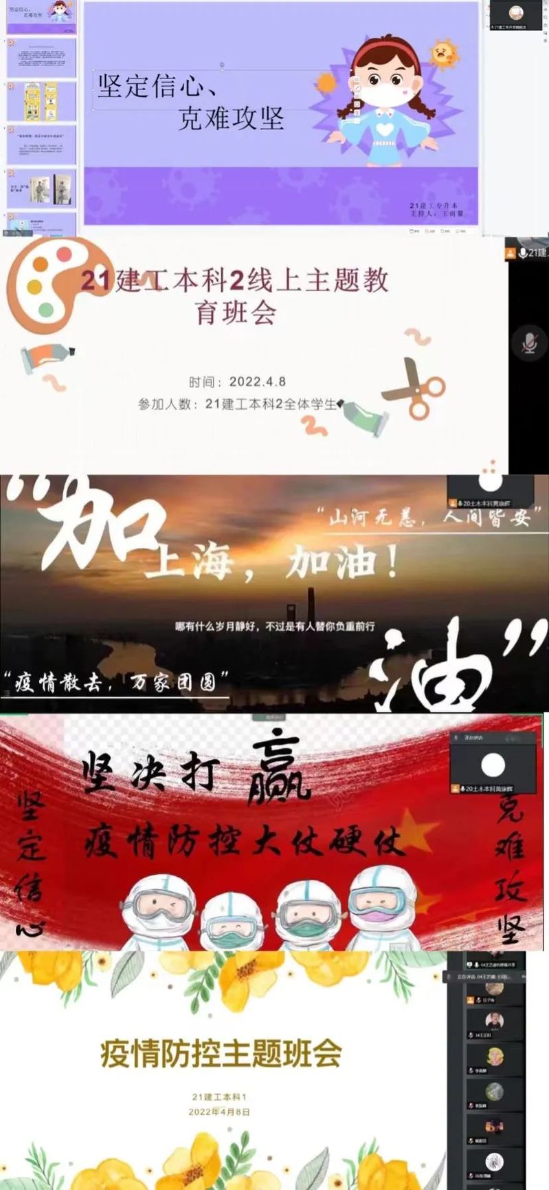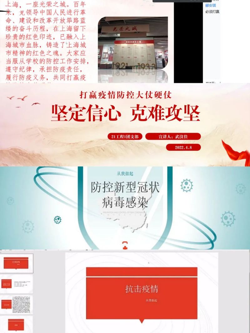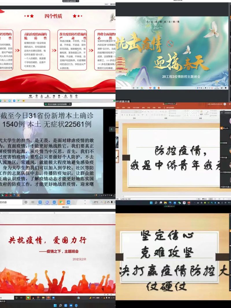 当前,上海新增本土确诊病例和无症状感染者仍在增长,部分地区传播仍未阻断,疫情仍在高位运行,防控形势严峻复杂。为把牢政治方向,传递正能量,鼓励英国365上市公司学生在疫情防控中贡献属于自己的青春力量,引导同学们正确掌握疫情防控工作的方法。2022年4月7日至4月9日,英国365上市公司以班级为单位召开“坚定信心、克难攻坚,坚决打赢疫情防控大仗硬仗”团日活动线上主题班会。本次活动在学院各班级内开展,以腾讯会议等作为平台,学院辅导员、20级、21级本专科同学参加,由各班班委主持。