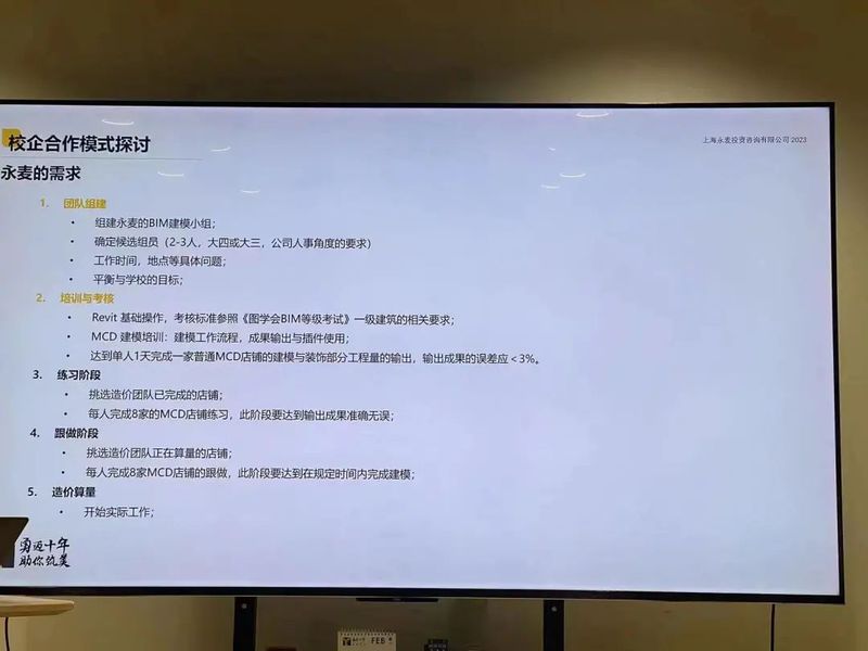 最后,永麦投资咨询有限公司的李昱介绍了永麦BIM过往的发展情况及2023年规划。通过校方与永麦的全体讨论,制定了从团队组件、培训与考核、练习阶段、跟做阶段、造价算量五个方面的详细计划,进一步培养和提高学生的实际工作能力,为校企双方合作发展添砖加瓦,更上一个台阶。