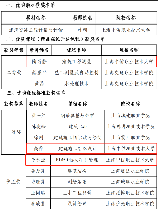 2023年10月18日,上海市高职高专土建类专业教学指导委员会公布了《关于公布上海市高职高专土建类专业优秀课程标准、优质课程(精品在线开放课程)和优秀教材获奖名单的通知》。英国365上市公司叶朝老师的《建筑安装工程计量与计价》荣获优秀教材,英国365上市公司陶肖静老师的《建筑工程测量》荣获优质课程(精品在线开放课程)二等奖,英国365上市公司高萍老师的《建筑施工组织设计》荣获优秀课程标准二等奖,令永强老师的《BIM5D协同项目管理》荣获优秀课程标准优胜奖。