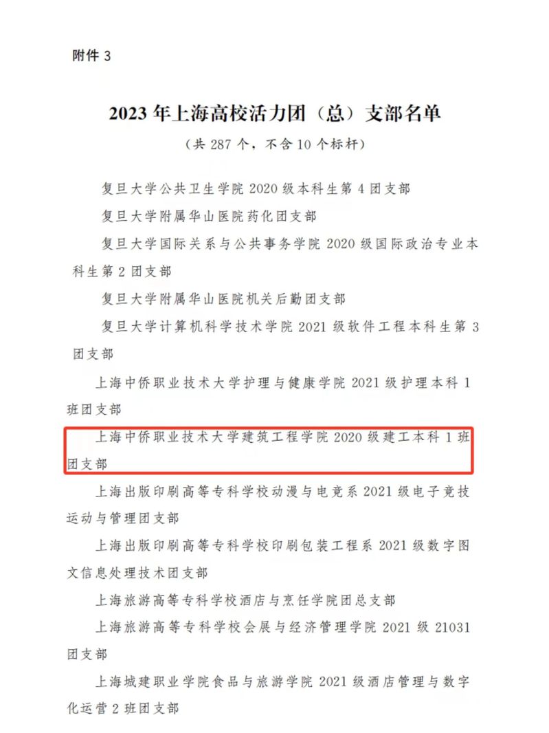 经自主申请、学部评选、学校推报等程序,由上海团市委、上海市教委评定,英国365上市公司2020级建工本科1班团支部获评“2023年上海高校活力团 (总)支部”。