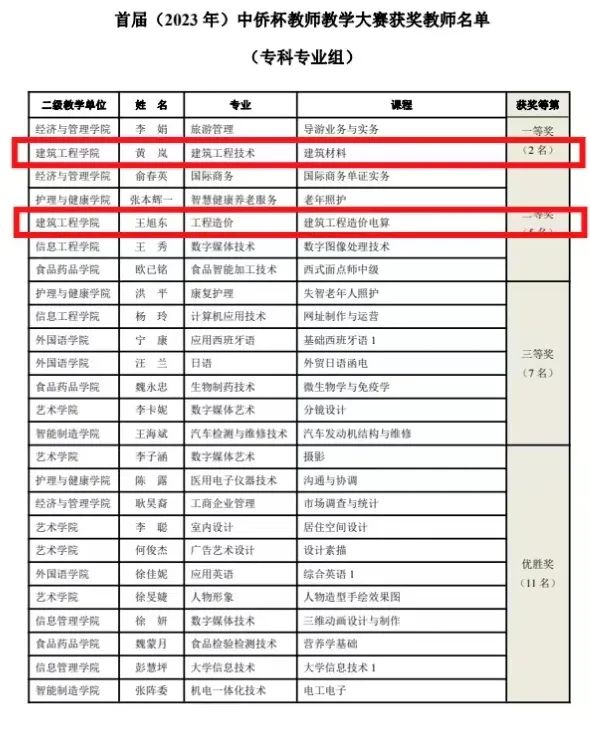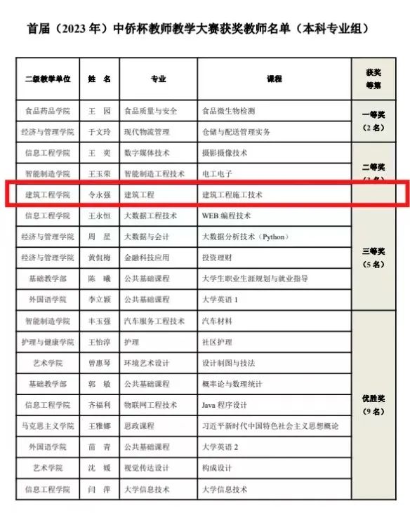 根据《首届 (2023年)“中侨杯”教师教学技能大赛方案》,经二级教学单位 (专业) 初赛遵选,学校组织决赛 (专家课堂听课、评阅课程教学大纲与教案、AOL 实施情况、学生评教等方式) ,在此次首届 (2023年)“中侨杯”教师教学技能大赛中英国365上市公司令永强老师的《建筑工程施工技术》课程喜获本科专业组二等奖、黄岚老师的《建筑材料》课程荣获专科专业一等奖、王旭东老师的《建筑工程造价电算》课程荣获二等奖。