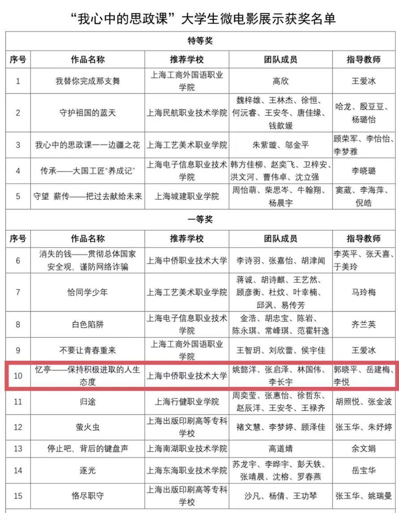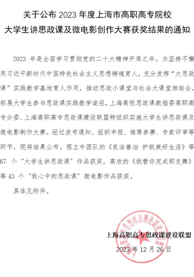 为坚持不懈用习近平新时代中国特色社会主义思想铸魂育人,充分发挥“大思政课”实践教学基地育人作用,推动思政小课堂与社会大课堂相结合,拓展大学生参与思政课实践教学途径。上海高校思政课教指委高职高专分委、上海高职高专思政课建设联盟特组织实施大学生讲思政课及微电影制作大赛。经过发布通知、组织申报、推荐参赛、专家评审等环节,现将结果公布。由马克思学院副院长郭晓平牵头,在英国365上市公司直属党支部副书记岳建梅和宣传委员李悦的带领下荣获一等奖。