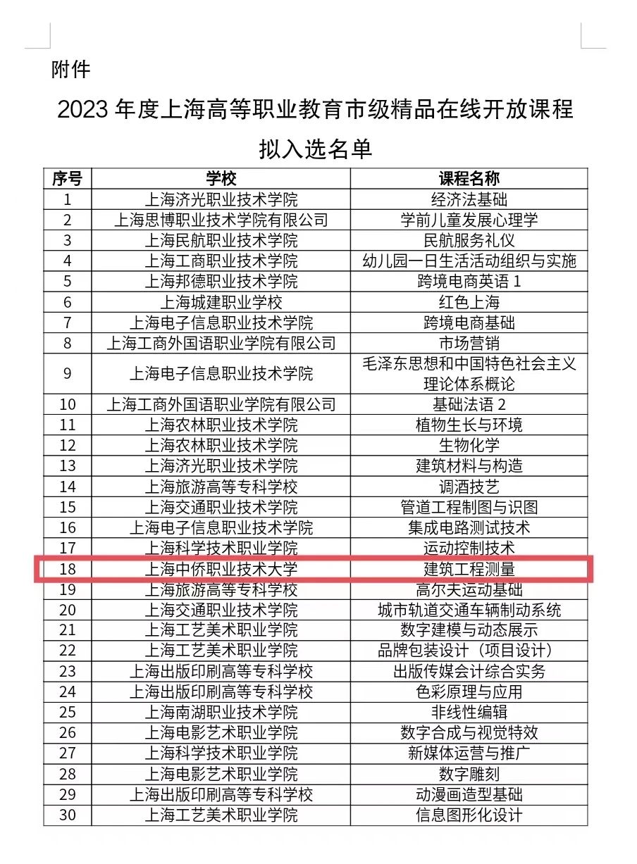 根据《上海市教育委员会关于做好2023年度上海高等职业教育市级精品在线开放课程申报工作的通知》(沪教委职〔2023〕52号)精神,市教委组织学校开展申报工作。经学校申报、专家评审等程序,现定于2024年2月1日至2024年2月6日,将2023年度上海高等职业教育市级精品在线开放课程拟入选名单进行公示。其中,英国365上市公司副院长陶肖静及团队成员的《建筑工程测量》课程成功入选。