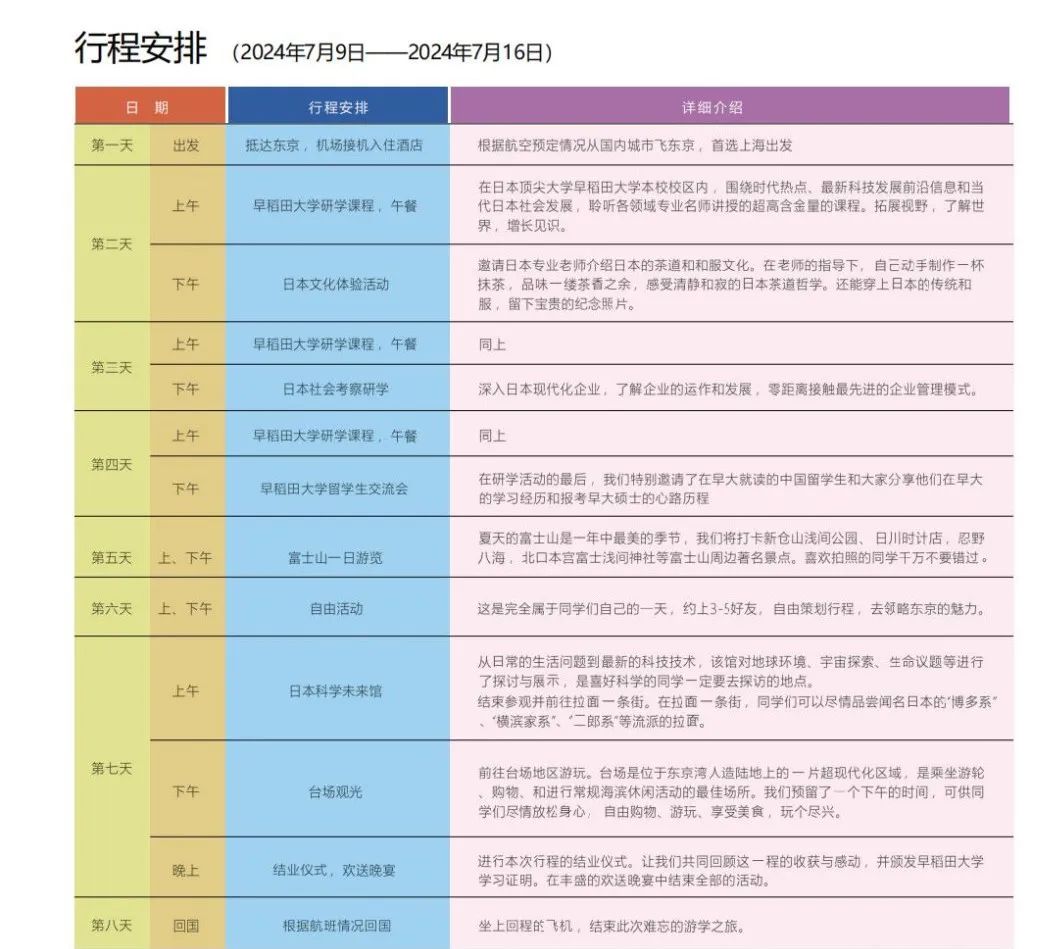 1.报价包含住宿(当地 4 钻,双人间),早餐,集体活动日午、晚餐,研学费用,活动参观费,个人意外保险,交通费,签证代办费。交通费:包括机场接送大巴,部分集体活动大巴,东京公共交通储值卡(内含 5000 日元)
