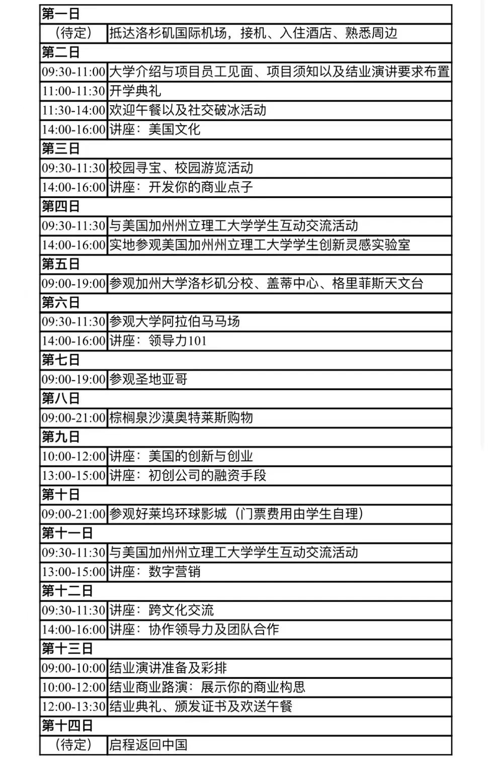费用包含所有课程、活动、校内参观、交流、住宿、接送机、四次外出参观用车、外出参观带领(除环球影城外)、开学仪式和结业仪式两次午餐、证书和成绩单费用;不含签证、机票、餐饮、个人消费等费用