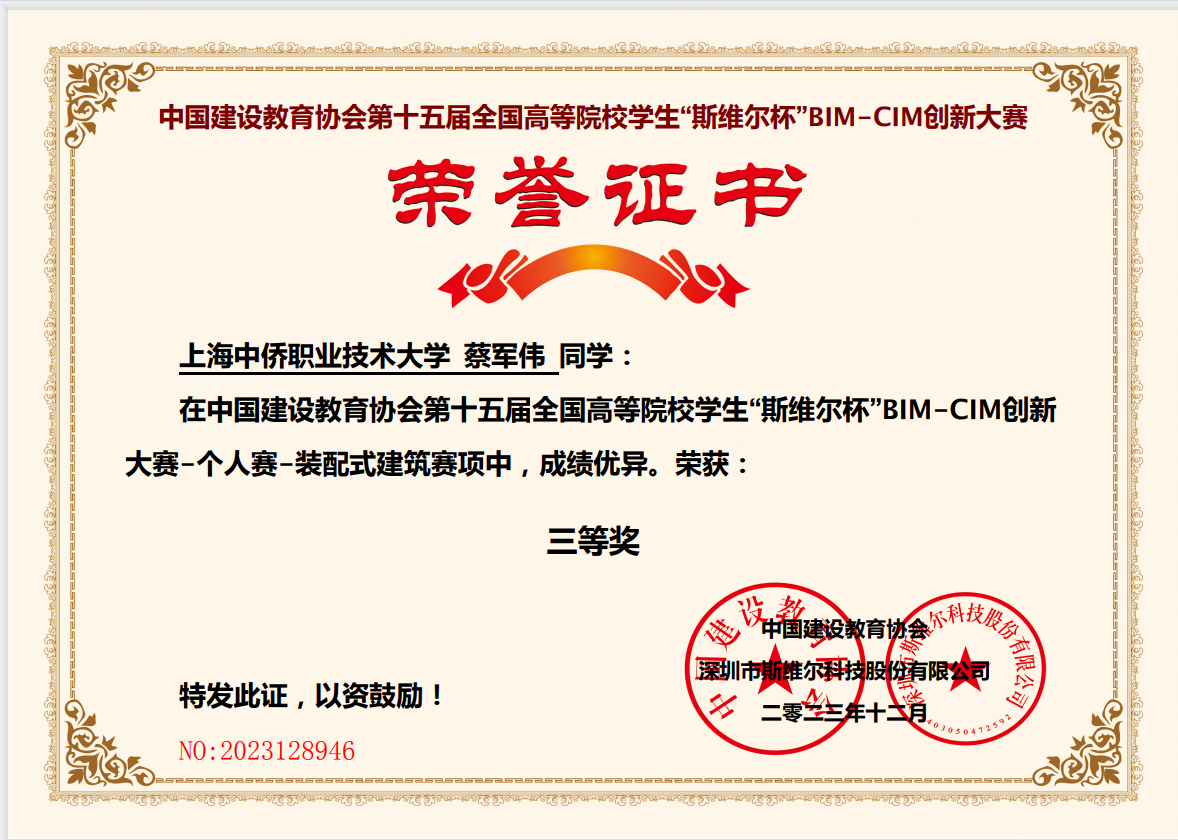 为充分发挥竞赛在促进高技能人才培训、推动开展职业技能培训等方面的重要作用,继续推进BIM、CIM技术在高等院校的教学与应用,深化复合型人才培养。中国建设教育协会举办第十五届全国高等院校学生“斯维尔杯”BIM-CIM创新大赛,英国365英国上市公司(MACAU-VIP认证)官网|Official Website 版权所有学子积极参加此项比赛。在指导老师的帮助下,英国365英国上市公司(MACAU-VIP认证)官网|Official Website 版权所有21建工本科1蔡军伟同学在个人赛-装配式建筑赛项中荣获三等奖。