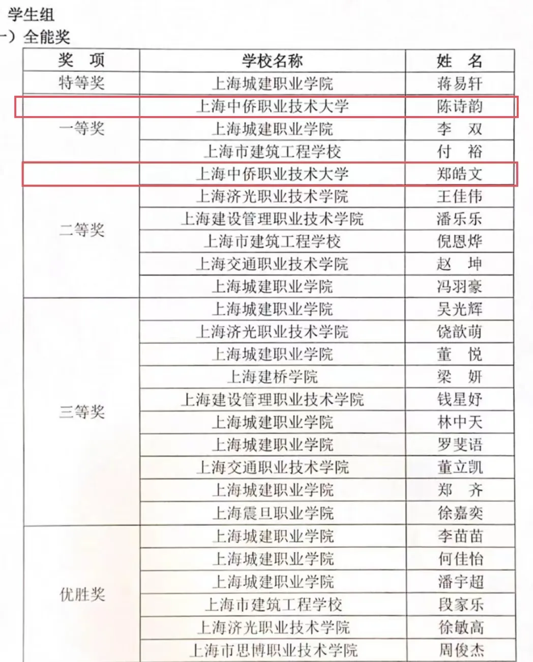 为加快智能建造与新型建筑工业化协同发展,推动建筑行业高技能人才队伍建设,上海建筑职业教育集团举办2023年“品茗杯”BIM应用技能大赛。近日,2023年“品茗杯”BIM应用技能大赛成绩揭晓,建筑工程专业陈诗韵与郑皓文同学荣获学生组全能奖一等奖与二等奖。