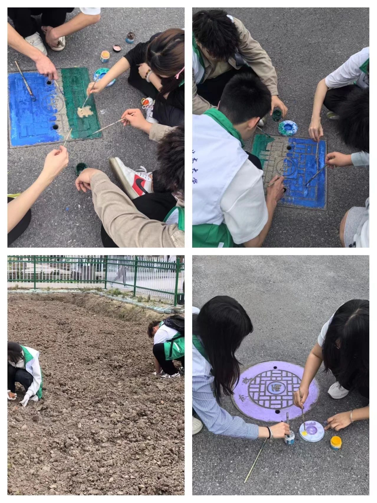 在实践活动中,学员们以五四精神、自然人文为启迪,井盖为画布,以青春爱国、环境保护为主题,充分发挥自己的创意和想象力,手持画笔与调色盘,一笔一笔认真勾画轮廓、上色、修边,每一个环节都一丝不苟。