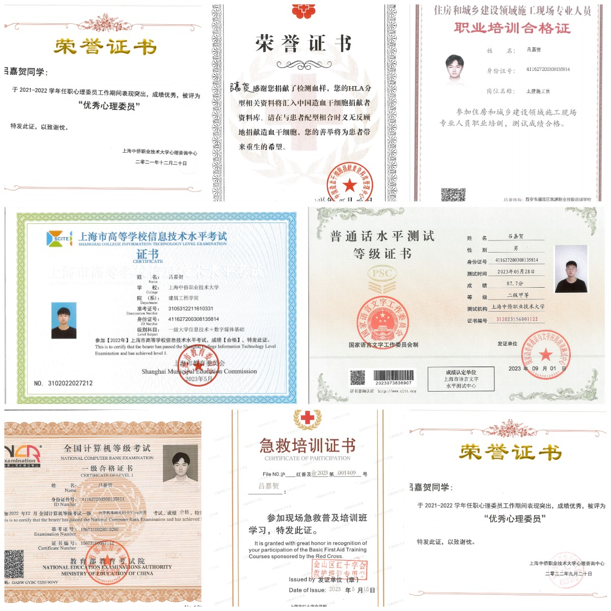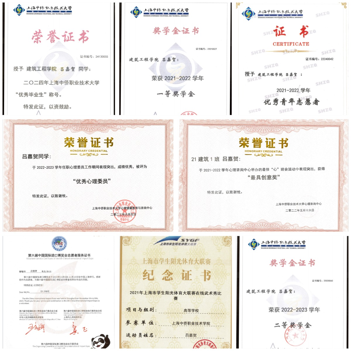 除了在学业上取得优异成绩,吕嘉贺还积极参与各种社会实践活动,在志愿工作中,他一直以“奉献、友爱、互助、进步”的精神为宗旨,对工作兢兢业业,恪尽职守,他曾参加“第六届中国国际进口博览会”的“小叶子”体验官志愿者,参加并组织 2022 年疫情核酸志愿者、“向阳计划”志愿者,社区儿童服务站志愿者、参与三次献血活动,造血干细胞入库,拥有急救员培训证书,还参加校记者团,对学校活动进行摄影,同时参加学校乐队,担任电吉他手,他在班级担任心理委员,不仅优化了班级生活学习的氛围,丰富了同学们的课余生活,还锻炼了自己的组织能力和领导才能。
