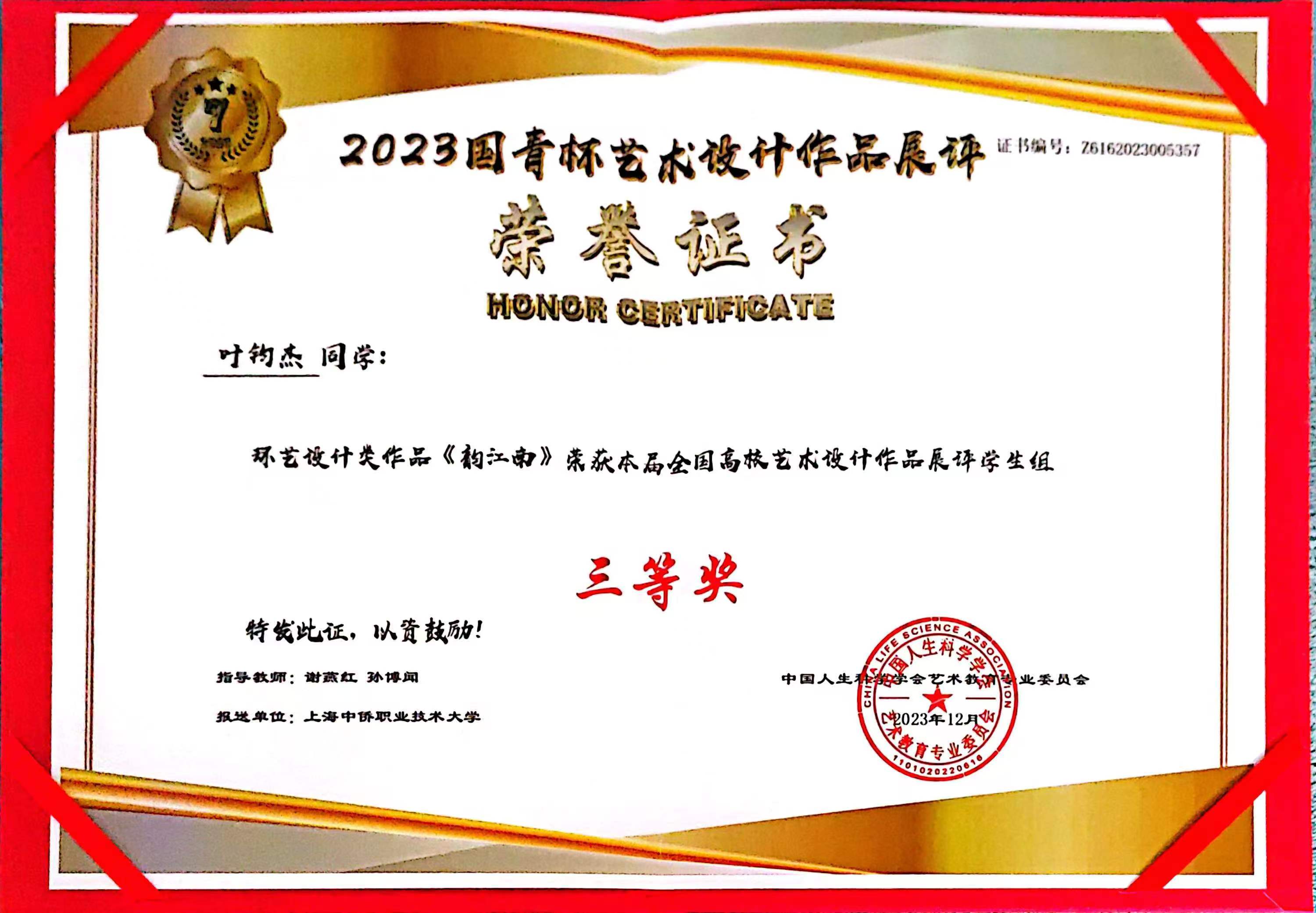 曾荣获2023 “国青杯”全国高校艺术与设计大赛三等奖
