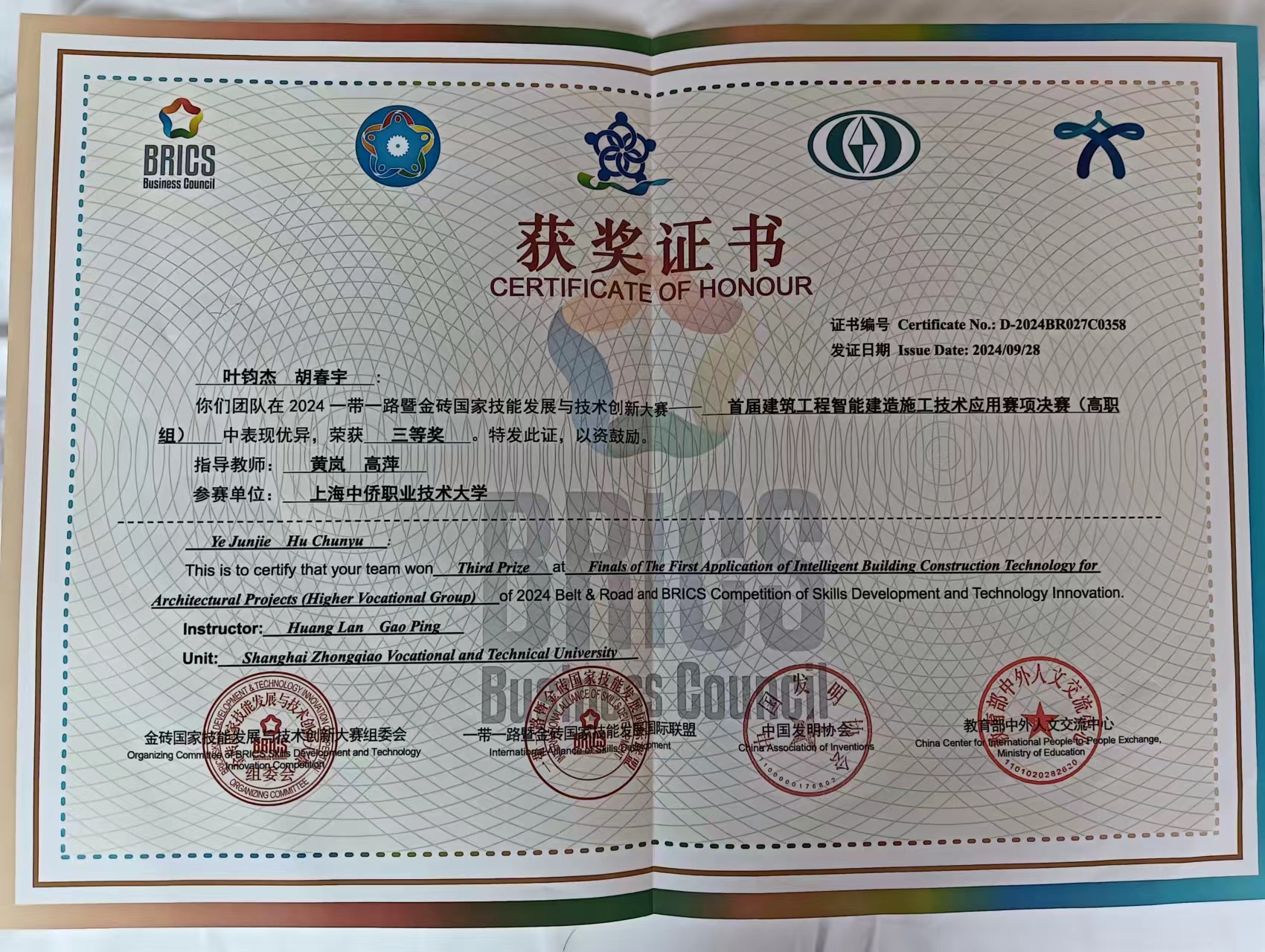 曾荣获2024一带一路暨金砖国家技能发展与技术创新大赛首届建筑工程智能建造施工技术应用赛项三等奖