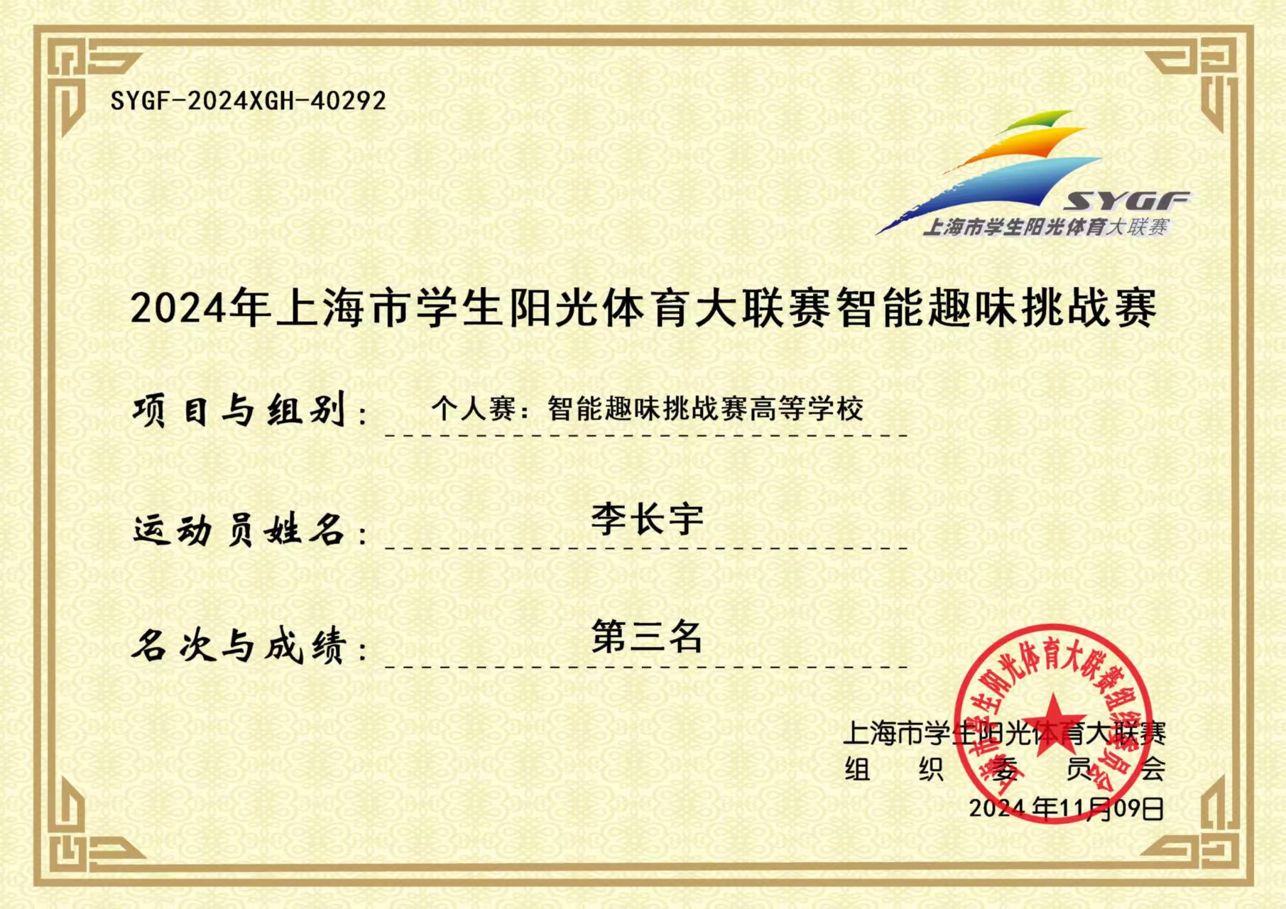 在2024年上海市学生阳光体育大联赛智能趣味挑战赛中,英国365上市公司李长宇同学通过多层选拔,经过多重闯关,最终获得个人赛:智能趣味挑战赛高等学校第三名。