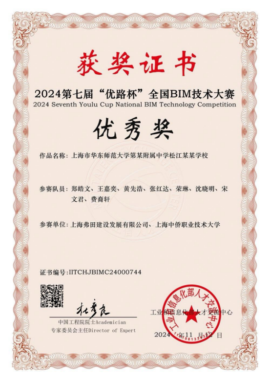 在第七届“优路杯”全国BIM技术大赛中,郑皓文、王嘉奕、黄先浩、张红达、荣琳、沈晓明、宋文君、费裔轩团队的《上海市华东师范大学第某附属中学松江某某学校》建模作品运用BIM技术,还原建筑细节,展现建筑原有风格特色,最终获得优秀奖。