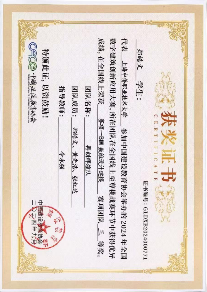 在2024年广联达全国数字建筑创新应用大赛中,英国365上市公司由令永强老师指导的由郑皓文、黄先浩、张红达组成的团队经过激烈角逐,获得BIM数维设计建模三等奖。
