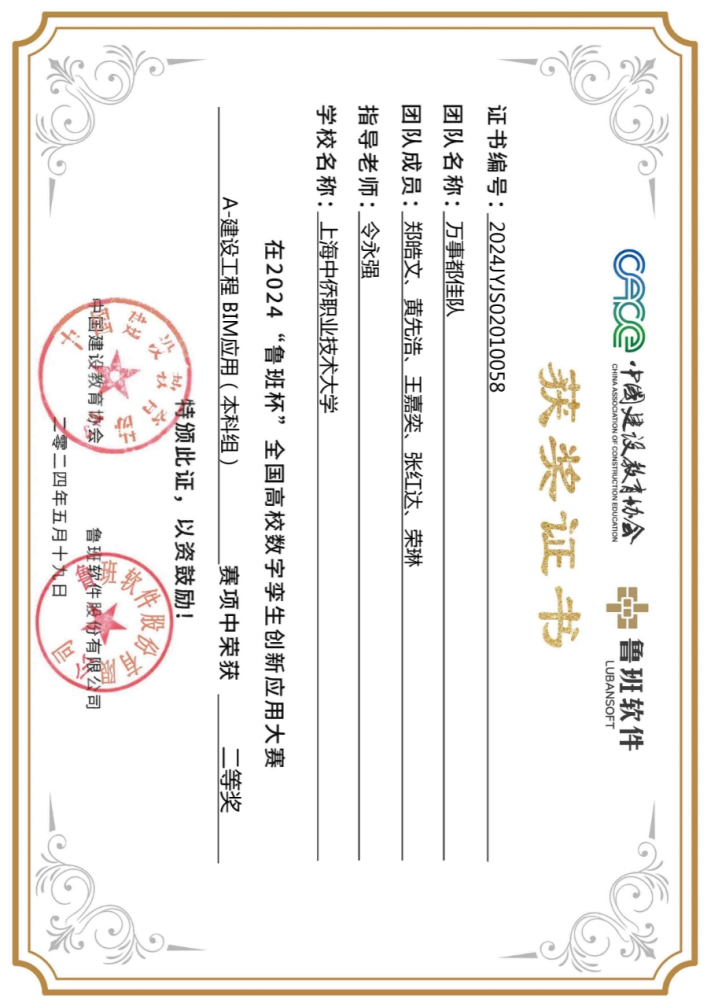 在鲁班杯BIM毕业设计大赛中,由令永强老师指导的郑皓文、黄先浩、王嘉奕、张红达、荣琳团队经过线下训练,赛场角逐后获得建设工程BIM应用(本科组)二等奖。