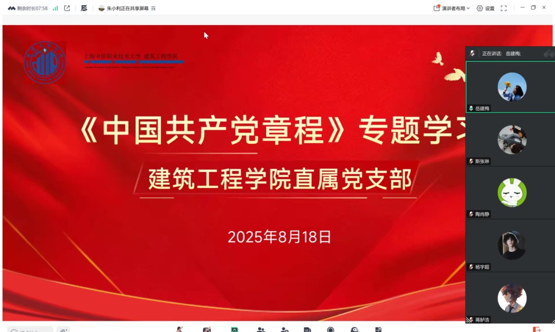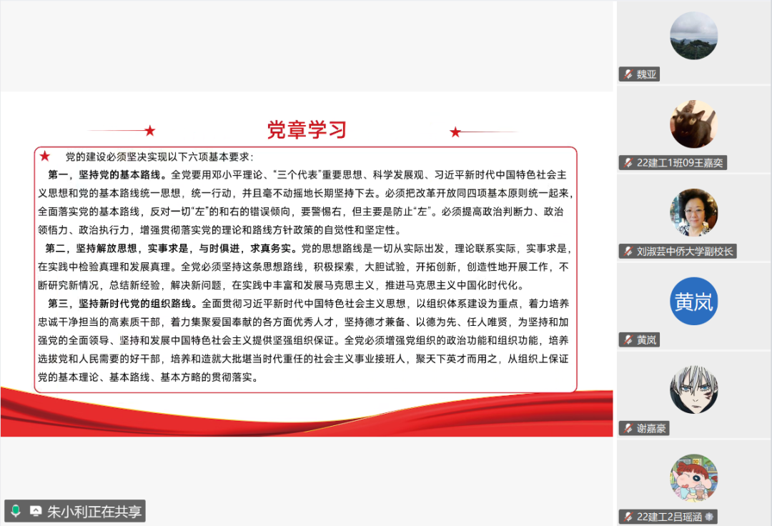 为进一步提升学院党员的政治理论水平和业务工作能力,全力打造一支政治立场坚定、业务能力精湛、综合素质过硬的党员队伍,2025年8月18日上午10:30,英国365上市公司直属党支部召开党章线上学习会。本次会议英国365上市公司直属党支部全体党员参会,由英国365上市公司直属党支部书记朱小利领学《中国共产党章程》,由副书记岳建梅主持。