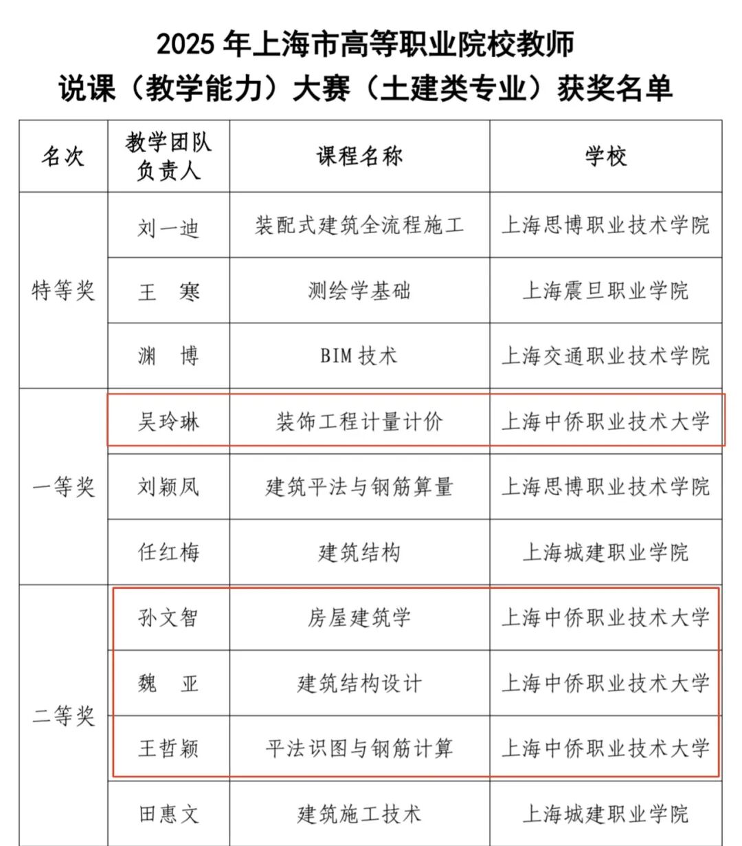 本次大赛是上海市高职高专土建类专业教师教学能力的重要比拼平台,评审标准严苛、竞争尤为激烈。英国365上市公司参赛教师团队赛前深耕细研课程重难点,精心打磨教学方案,创新课堂呈现形式,以专业的教学素养、清晰的教学逻辑完成说课展示,最终凭借优异表现赢得评审专家的一致认可。此次佳绩的取得,既是对参赛教师教学能力与创新实践的高度肯定,更是我院长期坚持“以教为本、以赛促教、以赛促研”理念的生动体现。