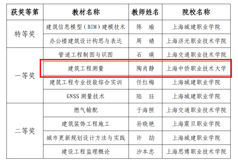 本次评选是衡量上海市高职高专土建类专业教材建设水准的重要标尺,不仅评审指标全面细致,专业要求更是对标行业前沿。我校陶肖静老师带领团队,紧扣高职土建专业的人才培养目标,深挖《建筑工程测量》的课程内涵,在教材中融入大量实操案例与行业新技术,以扎实的编写功底和贴合学情的内容设计交出高质量成果。这份一等奖的荣誉,是对教师专业能力的高度认可。