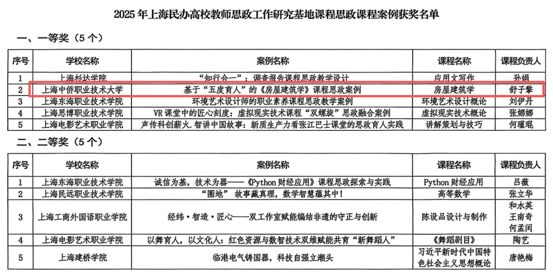 英国365上市公司专业主任舒子擎的“基于‘五度育人’的《房屋建筑学》课程思政案例”,经专家评审,在全市各民办高校推荐的90篇优秀案例中脱颖而出,荣获2025年上海民办高校教师思政工作研究基地课程思政案例评选一等奖。