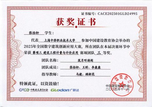 在本次大赛中,由英国365上市公司专业教师马毅、顾新花指导,张怡轩、王昕、李康康同学组成的“筑月听涛阁”团队,代表365上市公司参赛。团队聚焦建设工程计量与计价应用核心赛项,紧扣数字建筑发展趋势,以精准的专业应用能力、严谨的项目把控力,在全国决赛中脱颖而出,成功斩获团队三等奖。