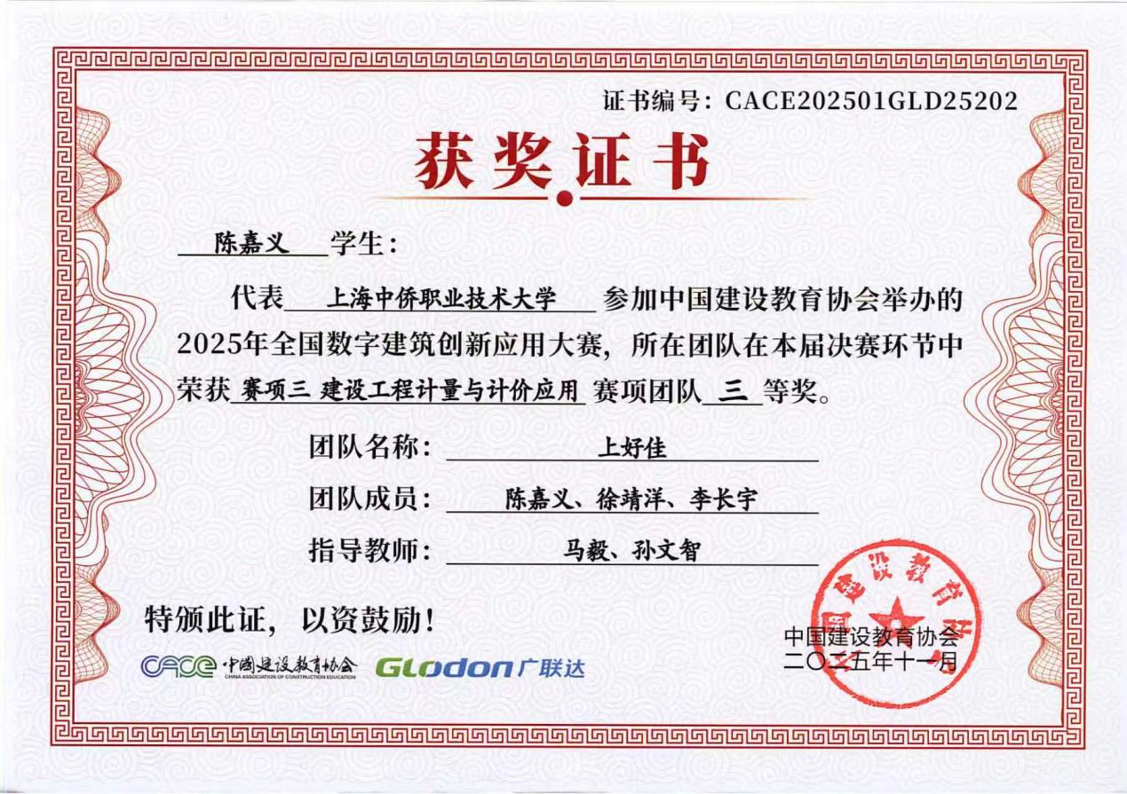 备赛期间,在马毅、孙文智两位指导教师的悉心指导下,团队成员陈嘉义、徐靖洋、李长宇不畏挑战、刻苦钻研,反复打磨竞赛方案,熟练运用数字建筑工具攻克实操难点。赛场上,他们沉着冷静、配合默契,精准完成各项竞赛任务,充分展现了我校学子精益求精的工匠精神和扎实的专业技能,最终在激烈角逐中脱颖而出,斩获殊荣。