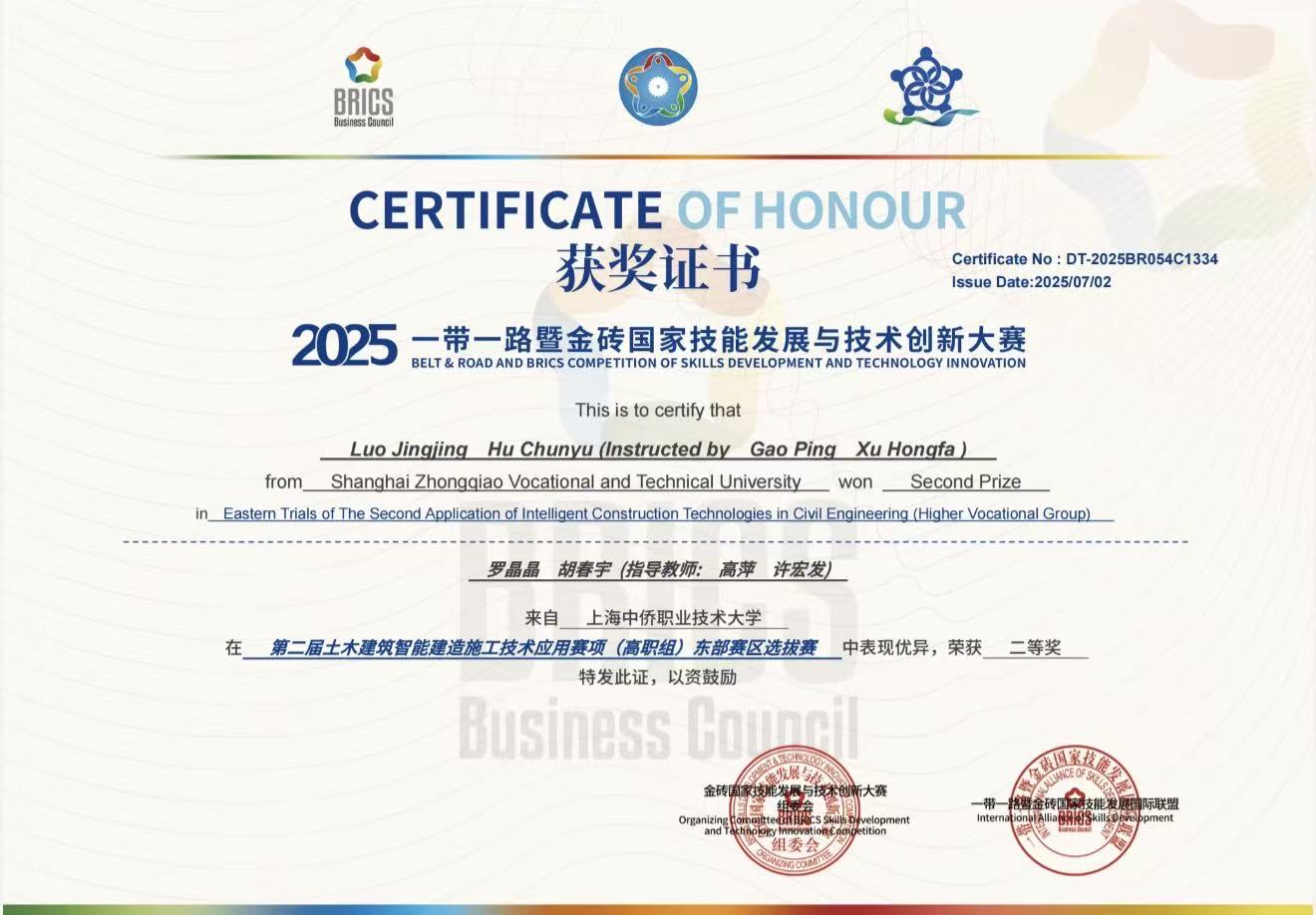 在本次大赛中,由英国365上市公司专业老师高萍、教授许宏发指导,罗晶晶、胡春宇同学组成的参赛团队,代表365上市公司参加2025一带一路暨金砖国家技能发展与技术创新大赛。在第二届土木建筑智能建造施工技术应用赛项(高职组)东部赛区选拔赛中,团队凭借精准的专业应用与高效的团队协作,在激烈角逐中脱颖而出,荣获二等奖。
