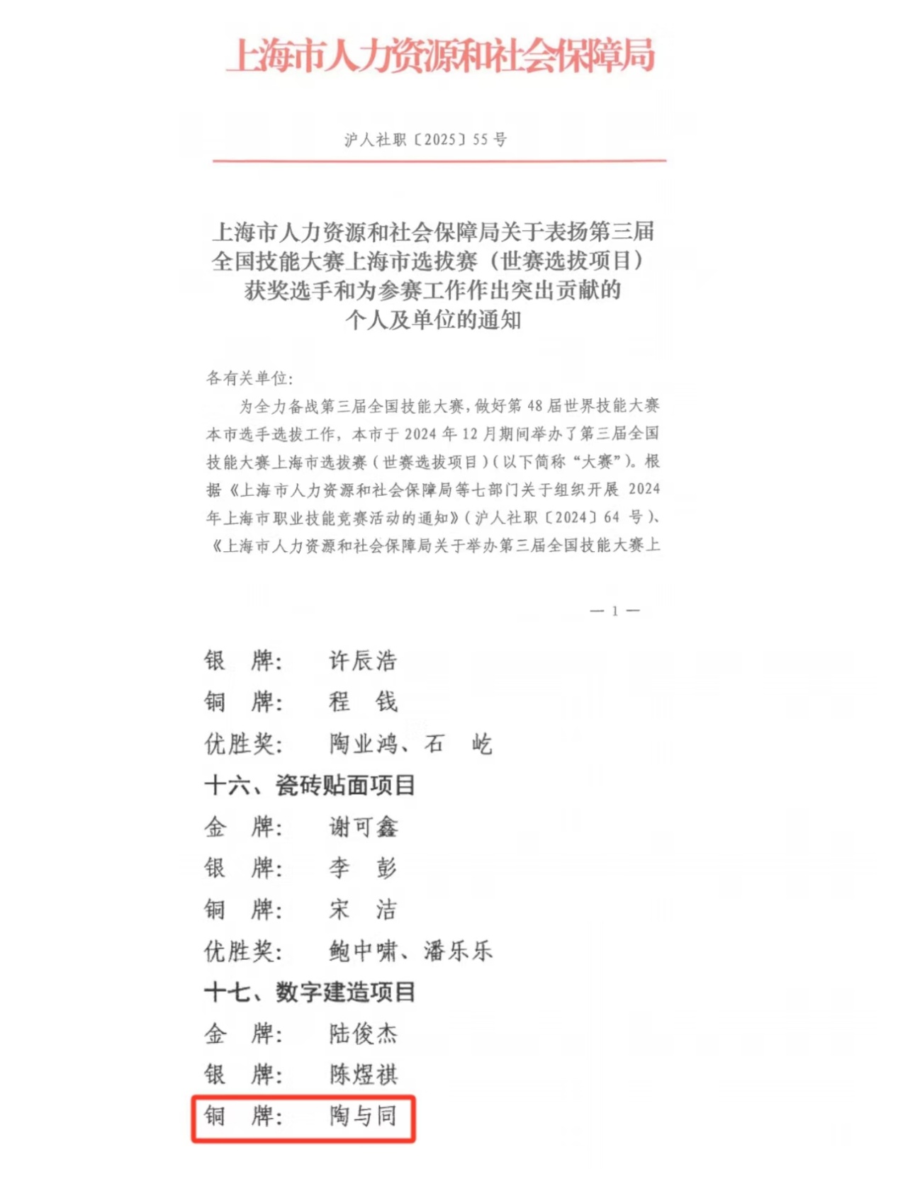 在数字建造项目的激烈角逐中,陶与同同学沉着应战、精益求精,以优异表现斩获铜牌,为学校争得荣誉。这一成绩不仅是其个人刻苦钻研、勤学苦练的成果,也彰显了上海中桥职业技术学院在数字建造等专业领域的教学实力与人才培养质量。
